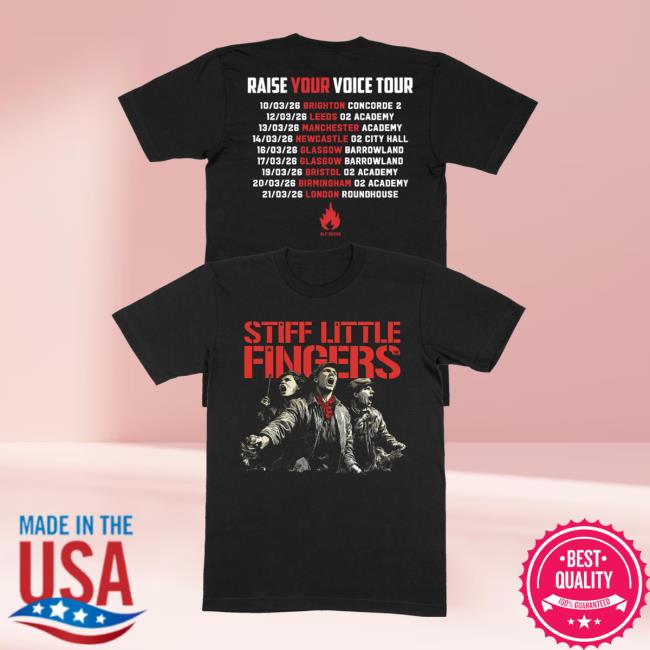 The Stiff Little Fingers Merch Shop Store Raise Your Voice Black Tour Shirt is a must-have item for fans of the legendary punk rock band. This exclusive tour shirt is designed to help you stand out from the crowd with its bold black color and striking graphic featuring the band’s iconic logo. Show your passion for music and rebellion by wearing this high-quality shirt that is perfect for concerts, festivals, or everyday wear. Made from durable materials, this shirt is not only fashionable but also comfortable to wear all day long. Elevate your style with the Stiff Little Fingers Merch Shop Store Raise Your Voice Black Tour Shirt and let your voice be heard through your fashion choices